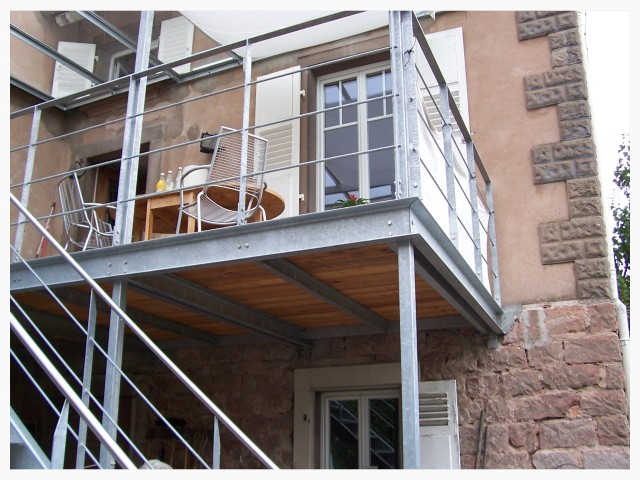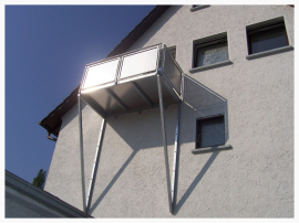 Stahlbalkone in feuerverzinkter Ausführung und bei Bedarf Pulverbeschichtung. Beläge: Holz, Aluminium Tränenblech, Balkoplan, Holzzementplatten Geländer: Stahlfeuerverzinkt oder Edelstahl nach Kundenwunsch.